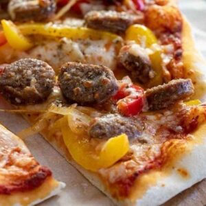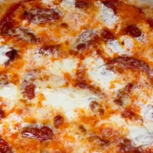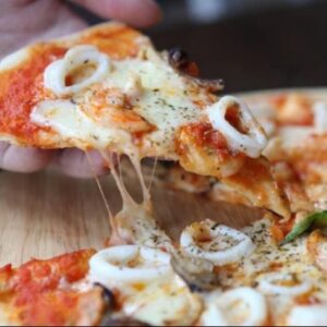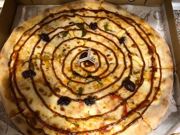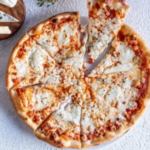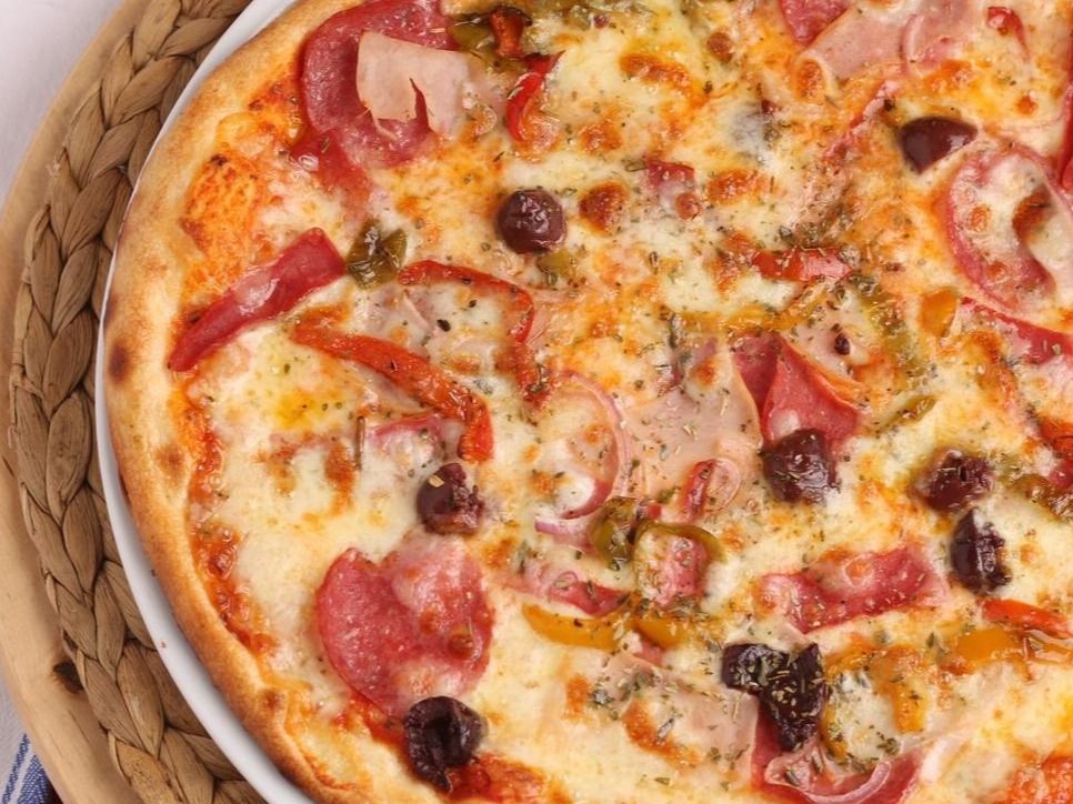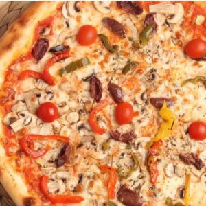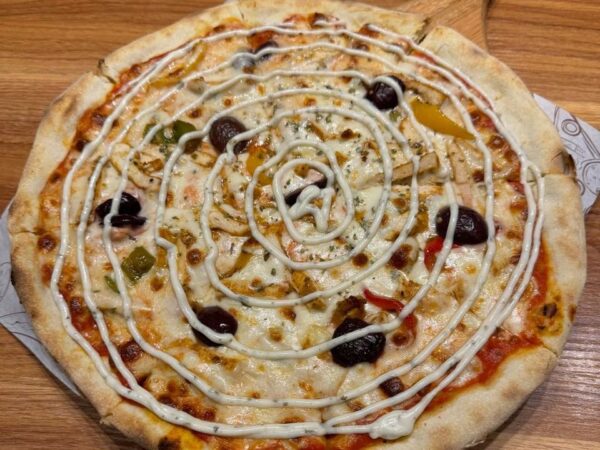 Tomato sauce, mozzarella, grilled chicken, grilled bell peppers, olives, ranch sauce, parmesan and oregano